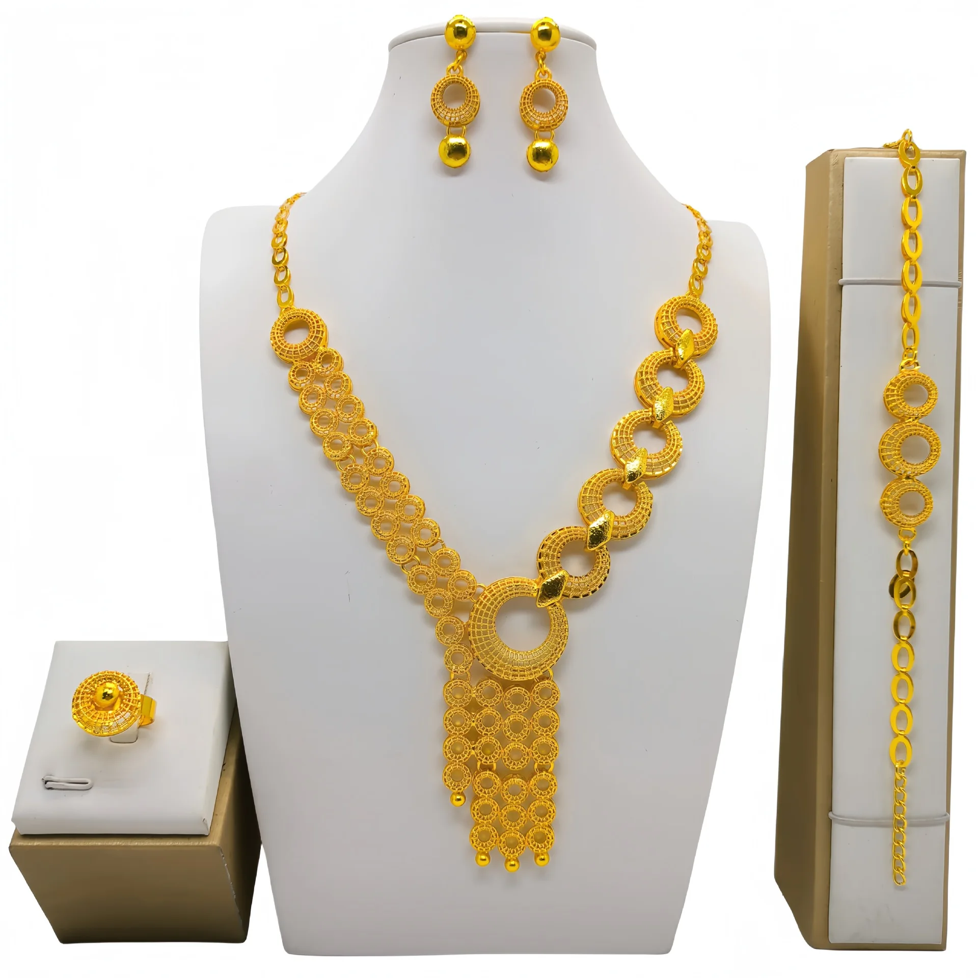 Arabic Women Gold Color Jewelry Sets Featured Round Pendant Earrings Rings Bracelets Suitable for Wedding Banquets Parties