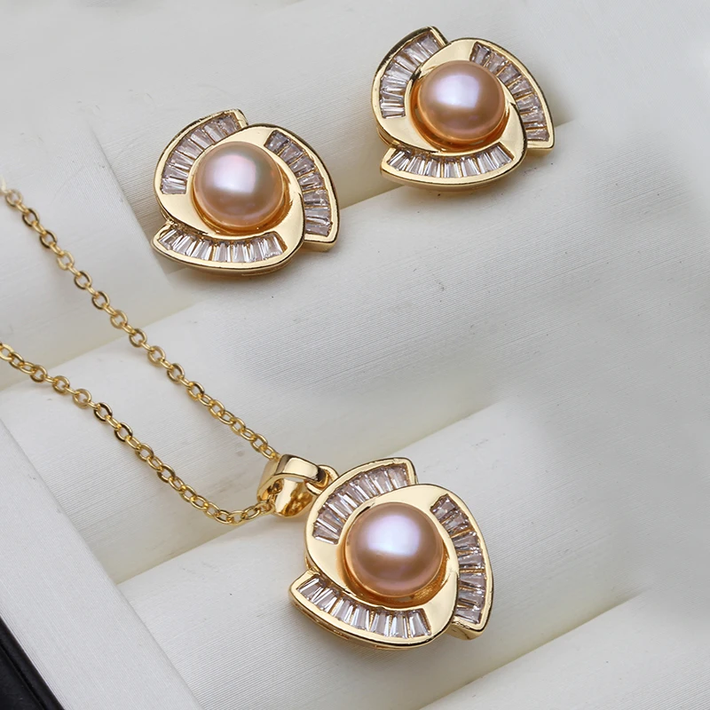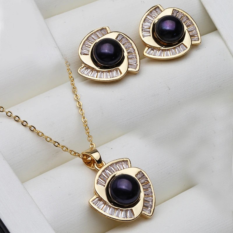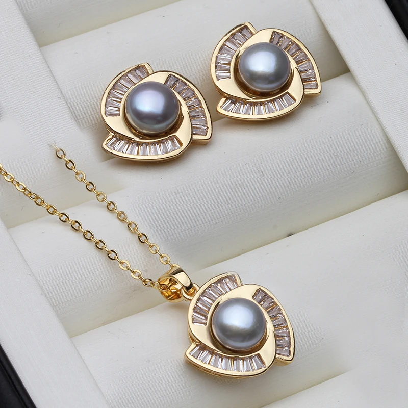 Real Natural Freshwater Set With Pearl Earrings And Necklace Woman,Gold Plated Pearl Set Wife Mother Gift Whife Pink Gray Black