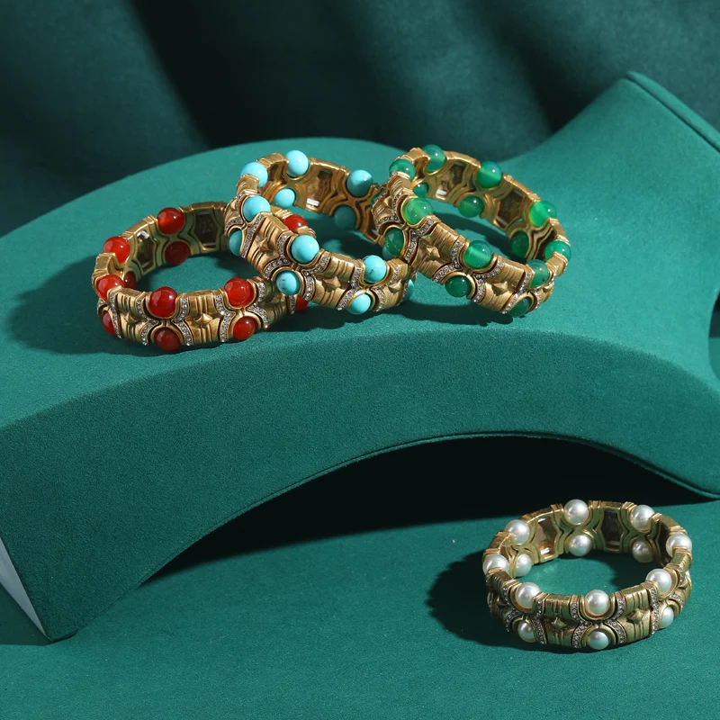 Vintage Blue Natural Stone Inlaid with Rhinestones Bangle Crystal Wide Bracelets Elastic Bamboo Knot Bohemian Handmade Jewelry